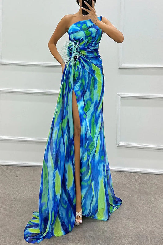 Illyra - Off-shoulder maxi-jurk met split en print